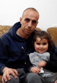 Husam AL-abasi with his daughter, rafif the ruin of the Ja’abis family’s home. Photo by Amer Aruri, B’Tselem, 9 March 2019